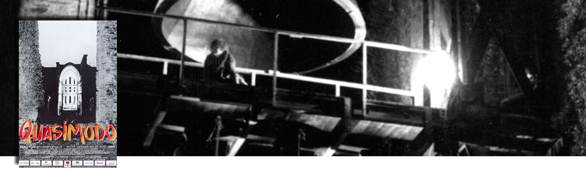 ...Alain Brunard, qui signe la mise en scène de Quasimodo, a incontestablement réussi à intégrer son premier travail théâtral dans les ruines cisterciennes. Le choix des trois lieux scéniques correspond judicieusement à la progression de l'action dont l'intensité dramatique trouve son point d'orgue dans la nef, où se dénoue et éclate tragiquement la relation triangulaire entre Frollo, Quasimodo et Esmeralda. Autre réussite éclatante: l'éclairage... L'interprétation est dominée par un Pietro Pizzuti qui réalise une incroyable performance autant vocale que physique, sous un maquillage superbe, comme les autres, de Jean-Pierre Finotto...