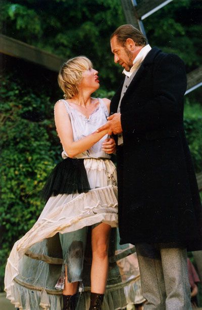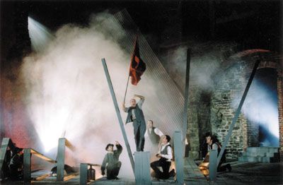 ... Menée à un rythme soutenu, dans une succession de séquences rapides et précises, cette première moitié du spectacle donne l'occasion à Pascal Racan de camper un forçat puissamment pathétique, face au Javert intraitable d'Olivier Massart. Isabelle Defossé touche au sublime dans l'effroyable chute de Fantine, fille-mère broyée sous les effets conjoints de la médisance de ses pairs et de la bienséance d'une bourgeoisie indifférente au malheur d'autrui. La récurrence des tableaux de groupe soulignés par une bande son expressive à souhait transcende la psychologie sommaire de ces personnages, tirés du réel par l'auteur certes, mais qu'il peint plutôt à la manière de types sociaux, à l'appui d'une thèse qui préfigure l'ouvre de Zola...