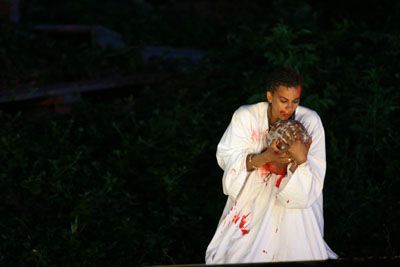 (…) Richard Kalisz a choisi la nef de l’abbatiale pour la célèbre danse des sept voiles. Les murailles sont couvertes d’inscriptions bibliques en hébreu, en latin et en grec. Projetées par rayon laser, elles se détachent avec une netteté surréelle. La danse de Fatou Traoré, réglée par Claudio Bernardo, s’avère sauvage, agressive, athlétique, mais elle n’est ni sensuelle ni lascive: c’est un rituel païen tout en extériorité. On soulignera la qualité et la prégnance de la musique et des chants exécutés par Malik Choukrane, Grégory Duret et Laurent Taquin. Ils contribuent à installer l’atmosphère d’archaïsme et de surnaturel voulue par le metteur en scène. On songe à leur prestation chorale en prélude au saisissant tableau final : debout dans les hautes herbes, sous les arbres violemment éclairés, ils nous font sortir du temps et de l’espace, pour rejoindre cette " beauté sombre de l’Apocalypse " qu’est Salomé aux yeux de Pierre Loti.