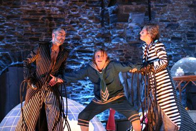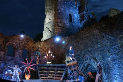 Un spectacle total. Voilà de quoi pourront, une fois encore, se vanter d’offrir les producteurs des spectacles d’été à Villers-la-Ville. Confiée au metteur en scène Stephen Shank, " La Balade du Grand Macabre " de Michel de Ghelderode (1898-1962), farce belgo-belge éblouissante, rassemble les principaux ingrédients de la recette de la réussite, à commencer par l’indispensable mise en valeur des ruines cisterciennes. Les subtils jeux de lumières sont bien entendus au rendez-vous cette fois encore mais pas de promenade nocturne cette année. Les spectateurs sont rivés à leur siège, installés de part et d’autre d’un gigantesque dispositif scénique qui traverse le cloître de part en part. C’est sur cette scène que va se jouer la fin du petit monde de la grotesque principauté de Breugellande, annoncée par un curieux personnage, le dénommé Nékrozotar. Dans ce rôle, un incroyable Pascal Racan –qui endosse ici son huitième rôle à Villers-et donne le ton à une irréprochable distribution dans laquelle on remarquera particulièrement Michel Poncelet (Porprenaz), Philippe Allard (Goulave) et Didier Colfs (Videbolle). Autre ingrédient d’une sauce qui prend : les costumes et les accessoires géants, le décor sonore, et la savoureuse loufoquerie de l’univers de Ghelderode. (…)
