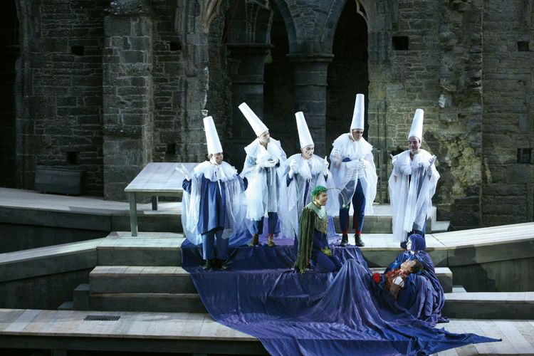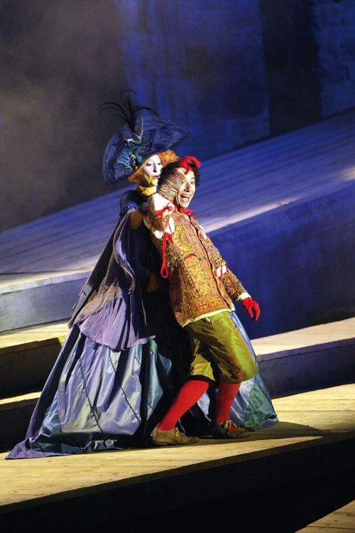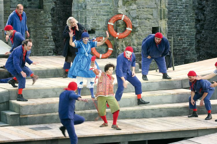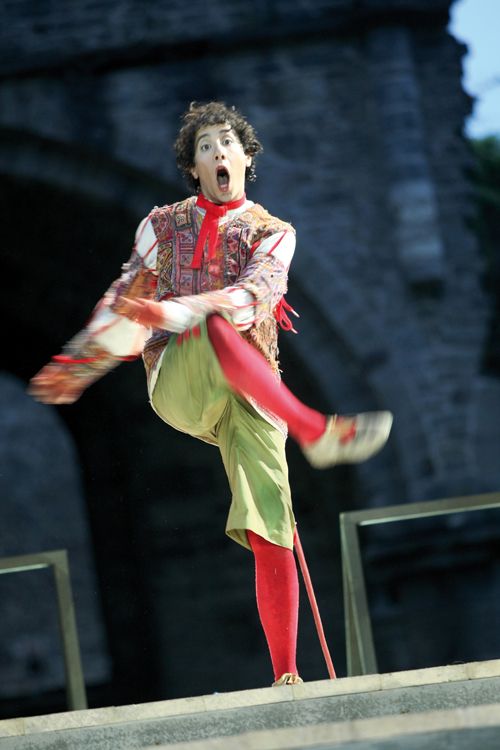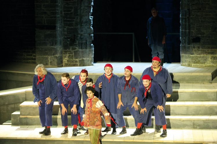 … Pour cette nouvelle mise en scène estivale signée Stephen Shank, la réalisation a installé la plus grande scène jamais réalisée pour une production théâtrale dans l’abbaye. Une installation scénique en étages déployée sur plus de 120 mètres. Les comédiens aux costumes baroques chatoyants apparaissent au gré du spectacle entre les étages ou les arcades de pierres anciennes formant le fond de la scène… Le jeune acteur Maroine Amimi monté sur ressorts incarne avec excellence le pantin de bois…