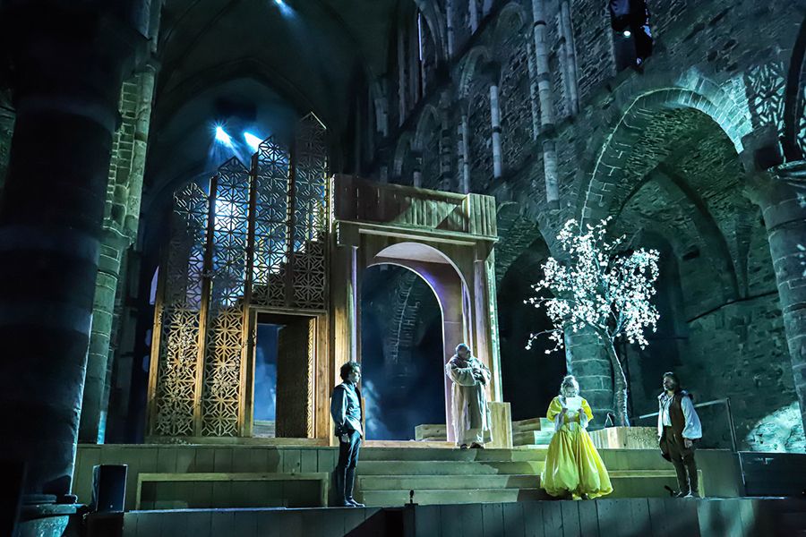 J’ai donc imaginé que tout le récit se passe dans le souvenir de nos deux héros. Nous commençons par quelques répliques du cinquième acte pour basculer dans le passé, quinze ans plus tôt. Et nous revenons bien entendu au cinquième acte, tel qu’il a été prévu par l’auteur. Cela permet de justifier la présence très forte et symbolique des ruines de l’abbaye.