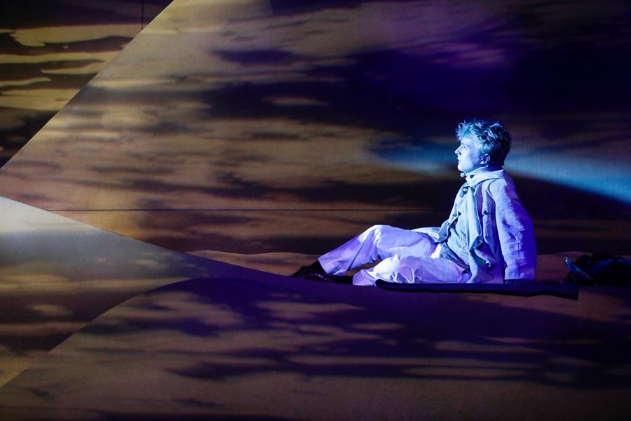 (…) A Villers-la-Ville, les grands spectacles en costumes se déploient généralement au milieu des ruines de l’abbaye offrant un décor de rêve. Cette année, surprise : la scène est logée dans un angle extérieur et occupée par une scénographie tout en hauteur et en sobriété. Quelques dunes stylisées et au sommet de la plus haute, un simple écran. A 21h30, un grondement se fait entendre et la queue d’un avion d’un autre temps apparaît entre deux dunes, suggérant l’accident. Aussitôt, un personnage en blouson de cuir déboule sur le plateau et s’affaire dans sa boîte à outils. Mais voici que surgit celui que tout le monde attendait : le Petit Prince en personne. Cheveux jaunes ébouriffés, épée au côté, long manteau flottant, écharpe autour du cou, il ressemble exactement à l’image qu’on s’en faisait. Et il prononce la phrase incontournable : « S’il vous plaît, dessine-moi un mouton ! »