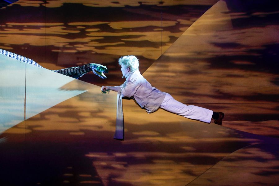 Ayant quitté sa petite planète (où vient d’éclore une rose jouée par Catherine Conet) pour visiter d’autres astéroïdes, le Petit Prince raconte son périple à l’aviateur au gré de ses rencontres avec une galerie d’habitants hauts en couleur. Grâce à un astucieux montage vidéo réalisé par Allan Beurms et Franck Villano, chaque personnage s’affiche sur un écran géant. Le Roi (Pascal Racan), le Vaniteux (Bruno Georis), le Buveur (Denis Carpentier), le Businessman (Éric de Staercke), l’Allumeur de réverbères (Camille Pistone) et le Géographe (Daniel Hanssens), chacune de ces apparitions est un vrai délice tant au niveau de l’interprétation que des superbes costumes, Stephen Shank et Maghet costumier. À cette ingéniosité du virtuel s’allie parfaitement l’authenticité du théâtre : attachantes marionnettes conçues par Anaëlle Impe, le Serpent et le Renard sont magnifiquement interprétés par Jordan Marty. De l’astéroïde B612 à Villers-la-Ville, Le Petit Prince ne cesse d’émerveiller, rappelant en ces temps houleux ô combien “on ne voit bien qu’avec le cœur, l’essentiel est invisible aux yeux”.